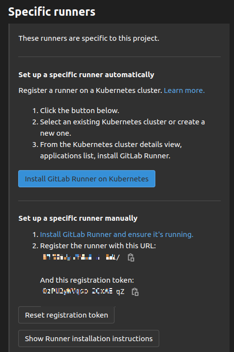 깃랩 프로젝트 => Settings => CI/CD => Runners 에 들어가서 레포지토리 정보와 토큰정보를 확인한다.